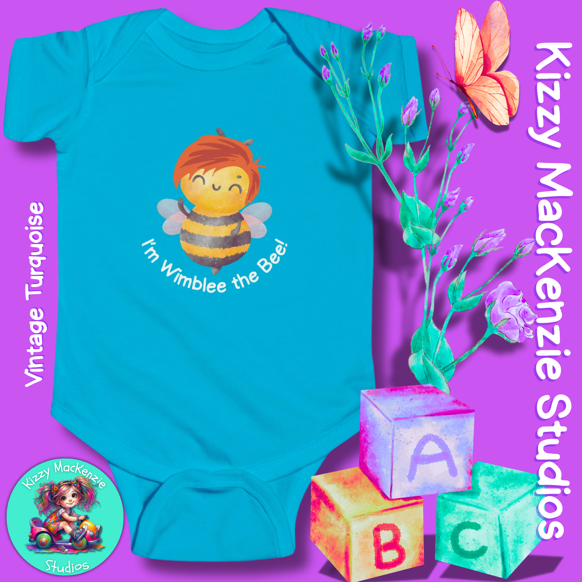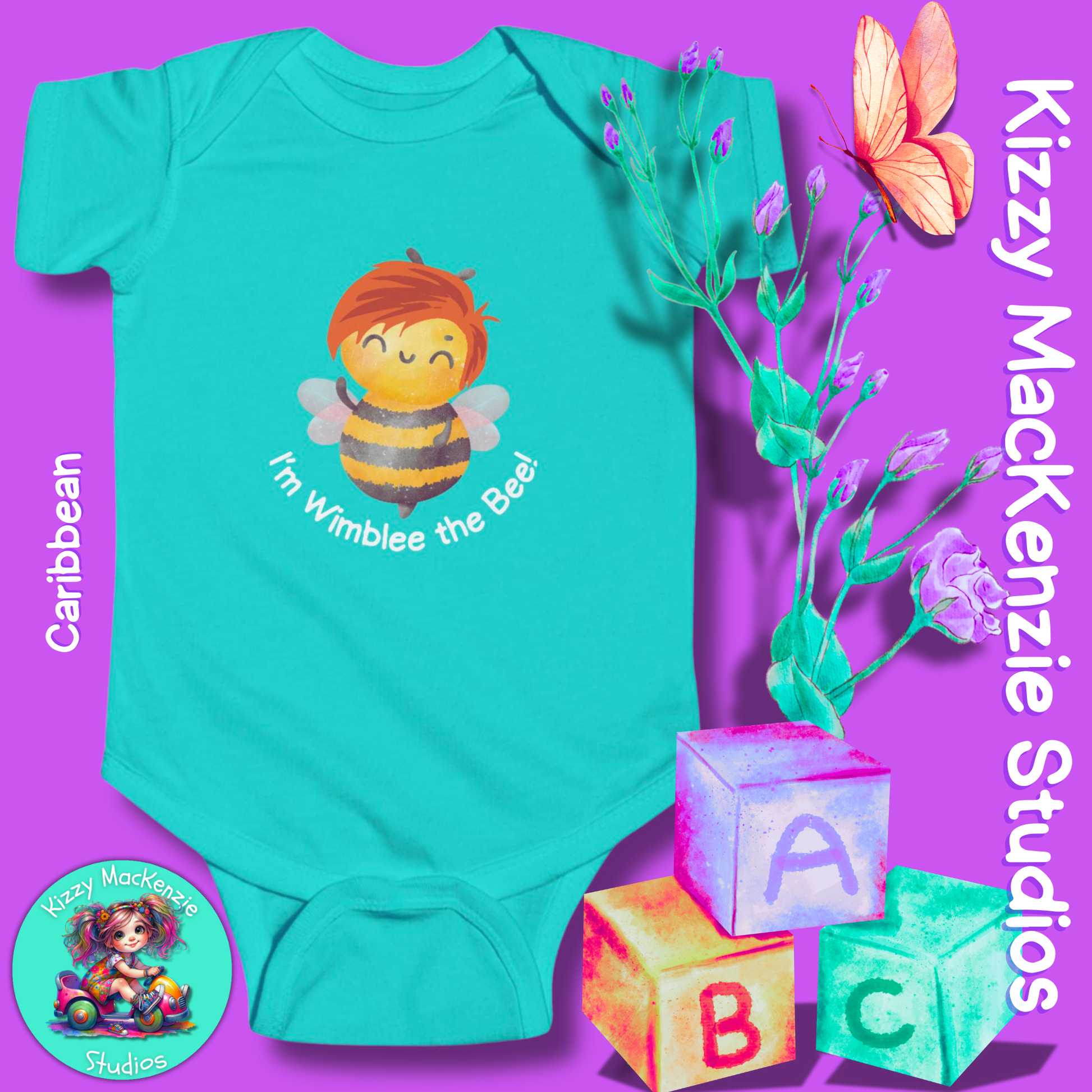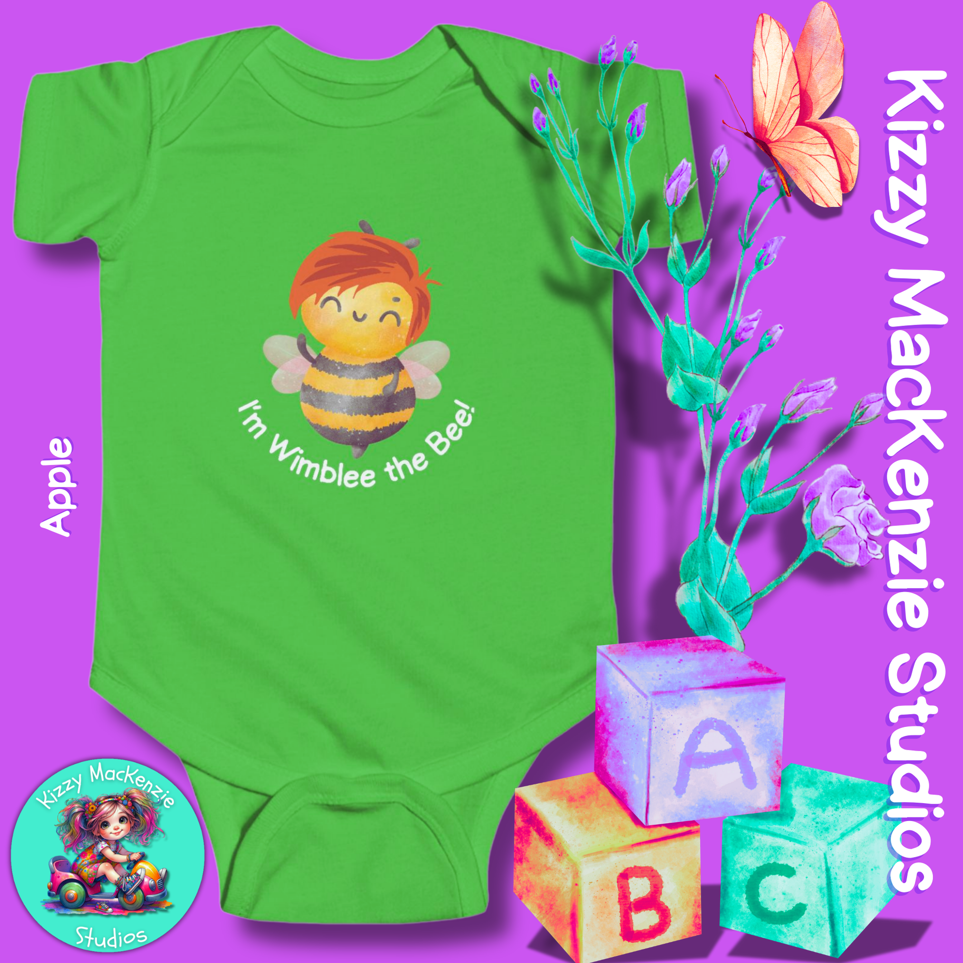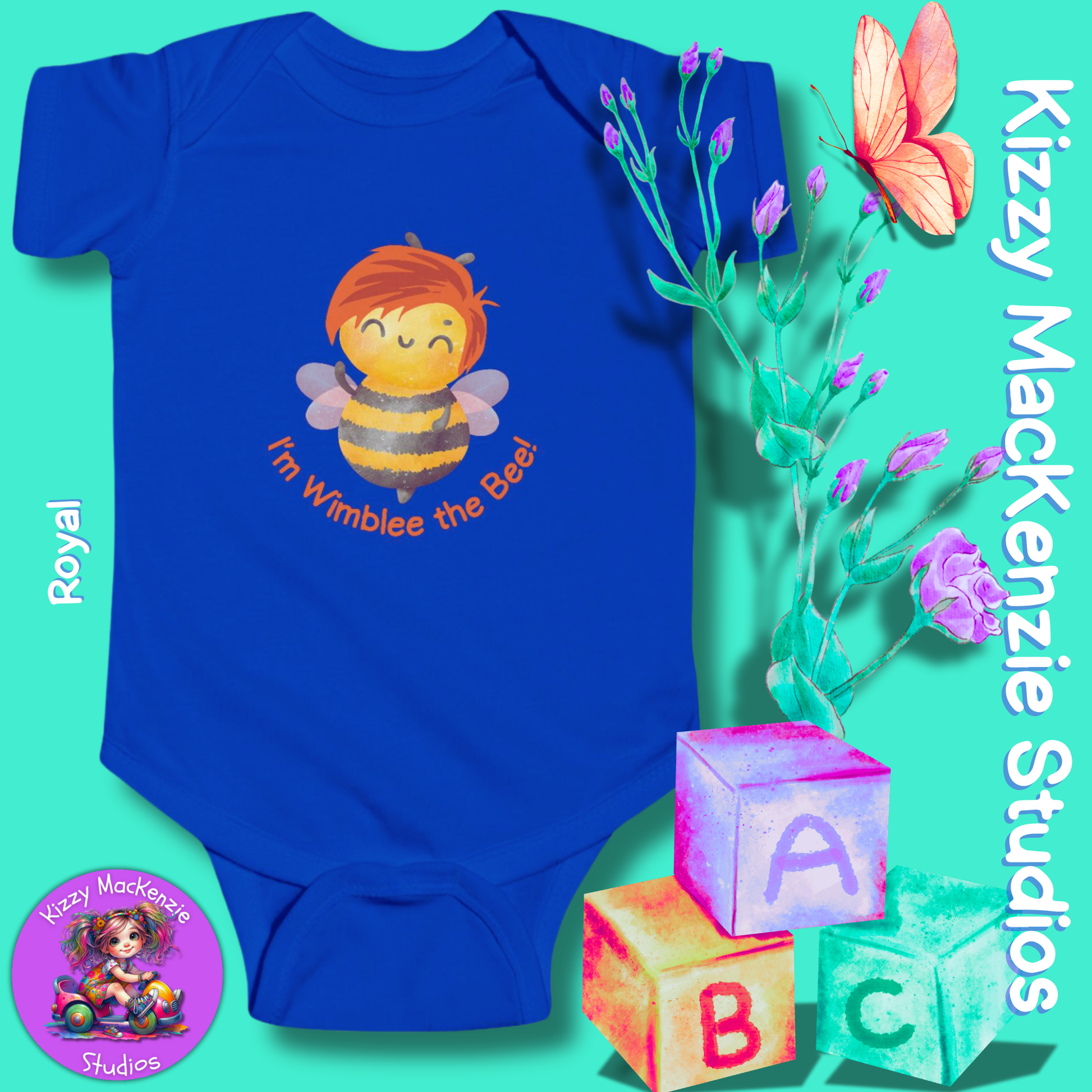 From the illustrated children's book, Wimblee the Bee, Wimblee is one bizzy honey bee who shares his love for Mother Nature — and pollen! — with his young readers. By showcasing the intricate relationship between honey bees (and other pollinators), humans, and Mother Nature herself — in rhyme — Wimblee teaches little ones the value of hard work, teamwork, and conservation. Now you too can share your love for Mother Nature — and Wimblee the Bee — with your baby, with this one-of-a-kind-sweet-as-honey Kizzy MacKenzie Studios infant onesie design!